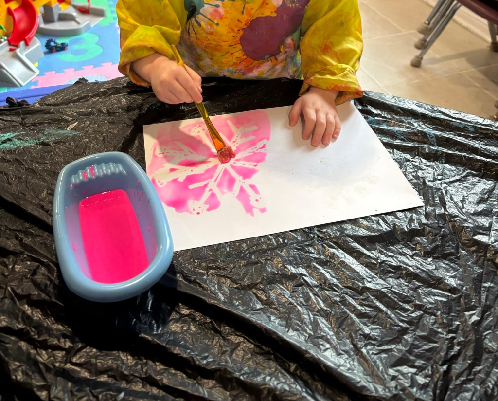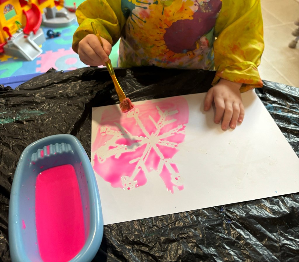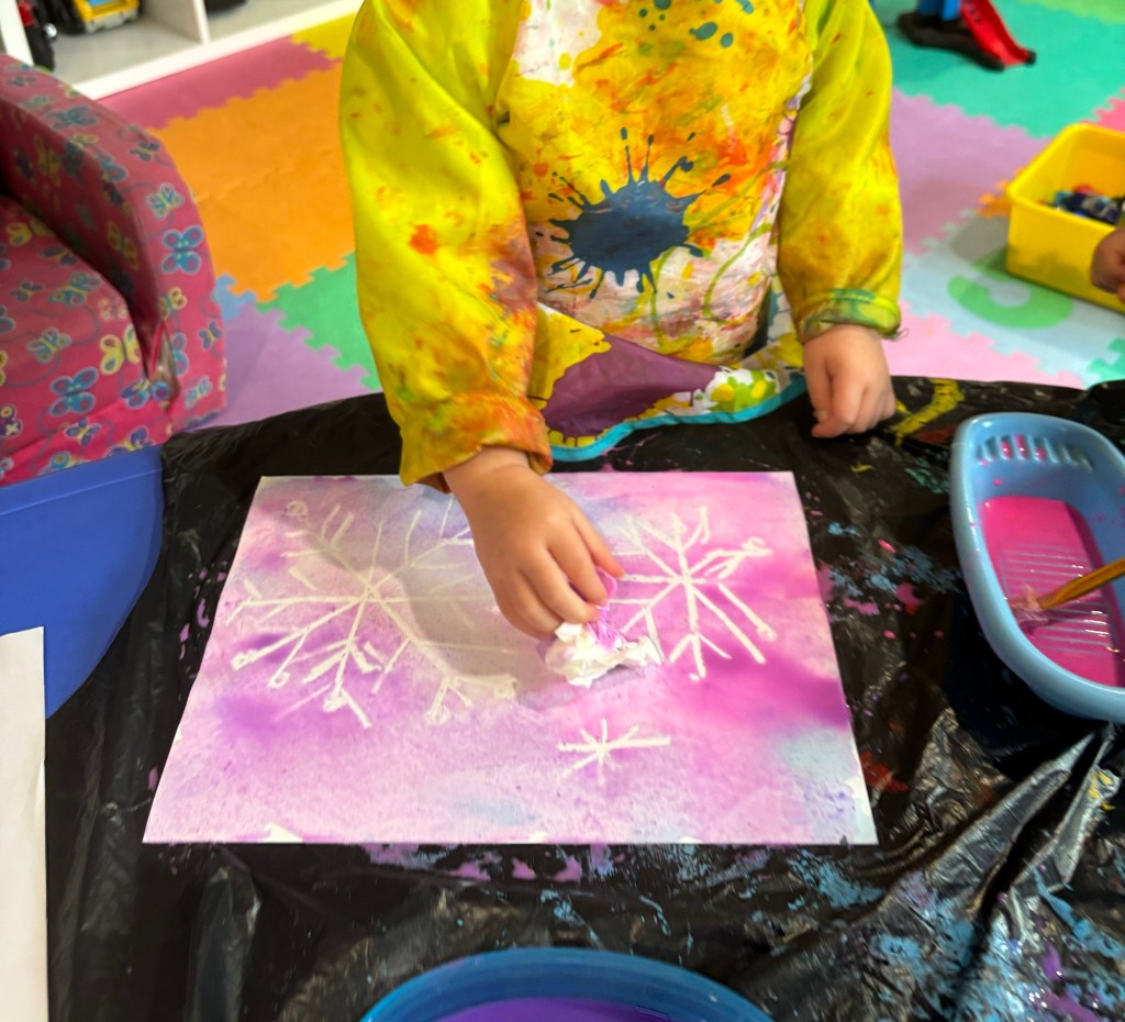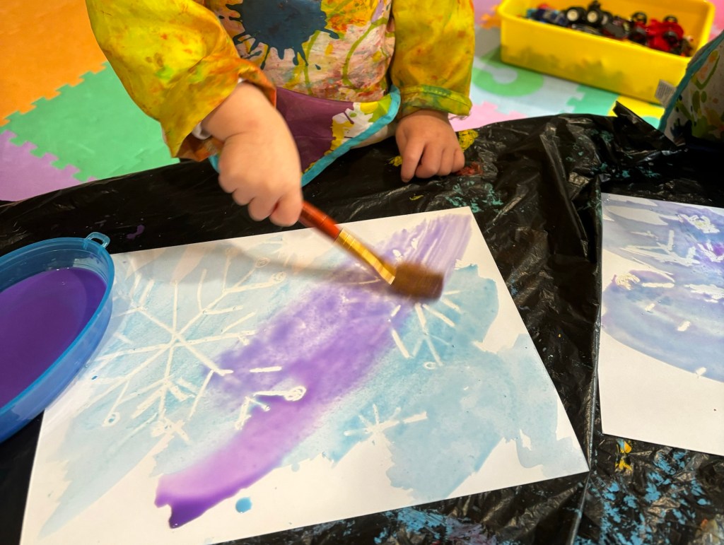 Today, we had an art class, and the children painted beautiful snowflakes with watercolors.