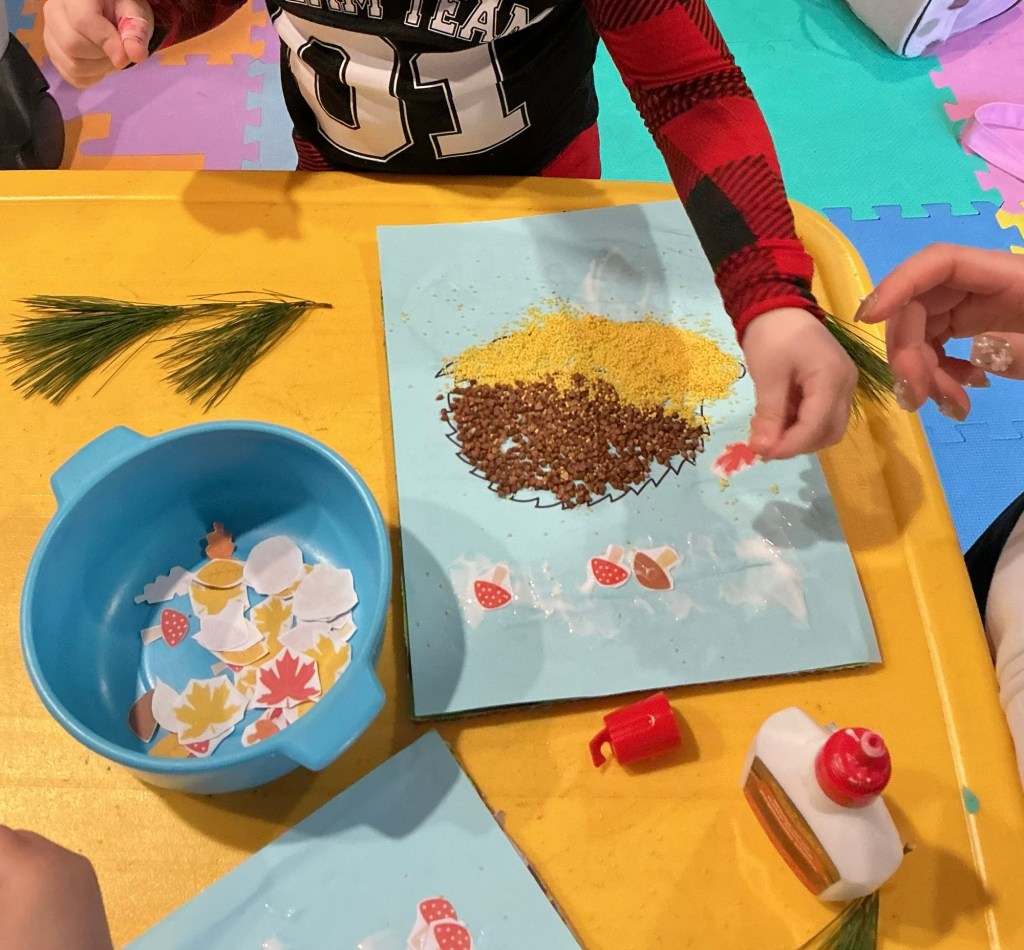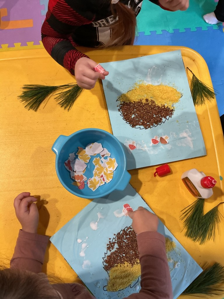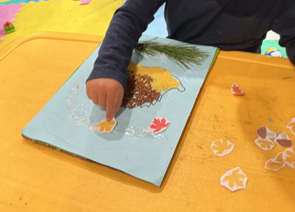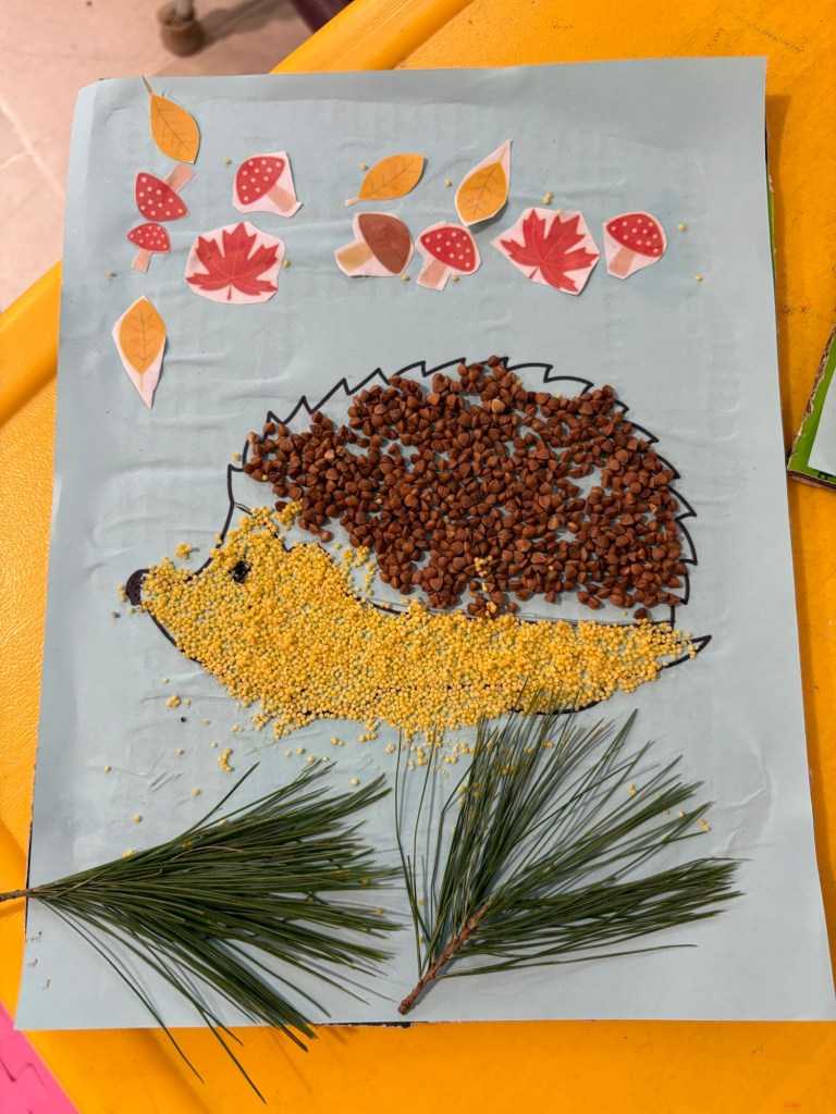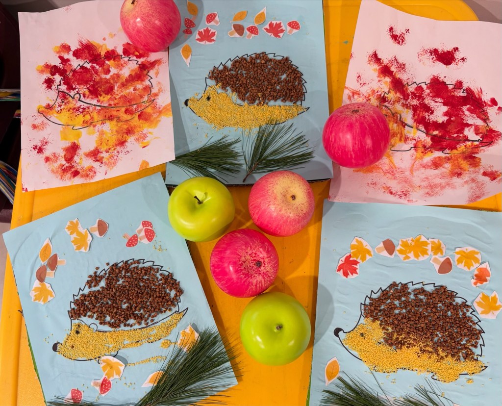 Today we had a fun Fall Art and Craft activity. The children worked with yellow millet and glue, decorating a cute autumn hedgehog and a colorful leaf fan. They really enjoyed exploring the textures, creating their designs, and showing their creativity. It was a lovely hands-on activity, and everyone was very proud of their artwork!